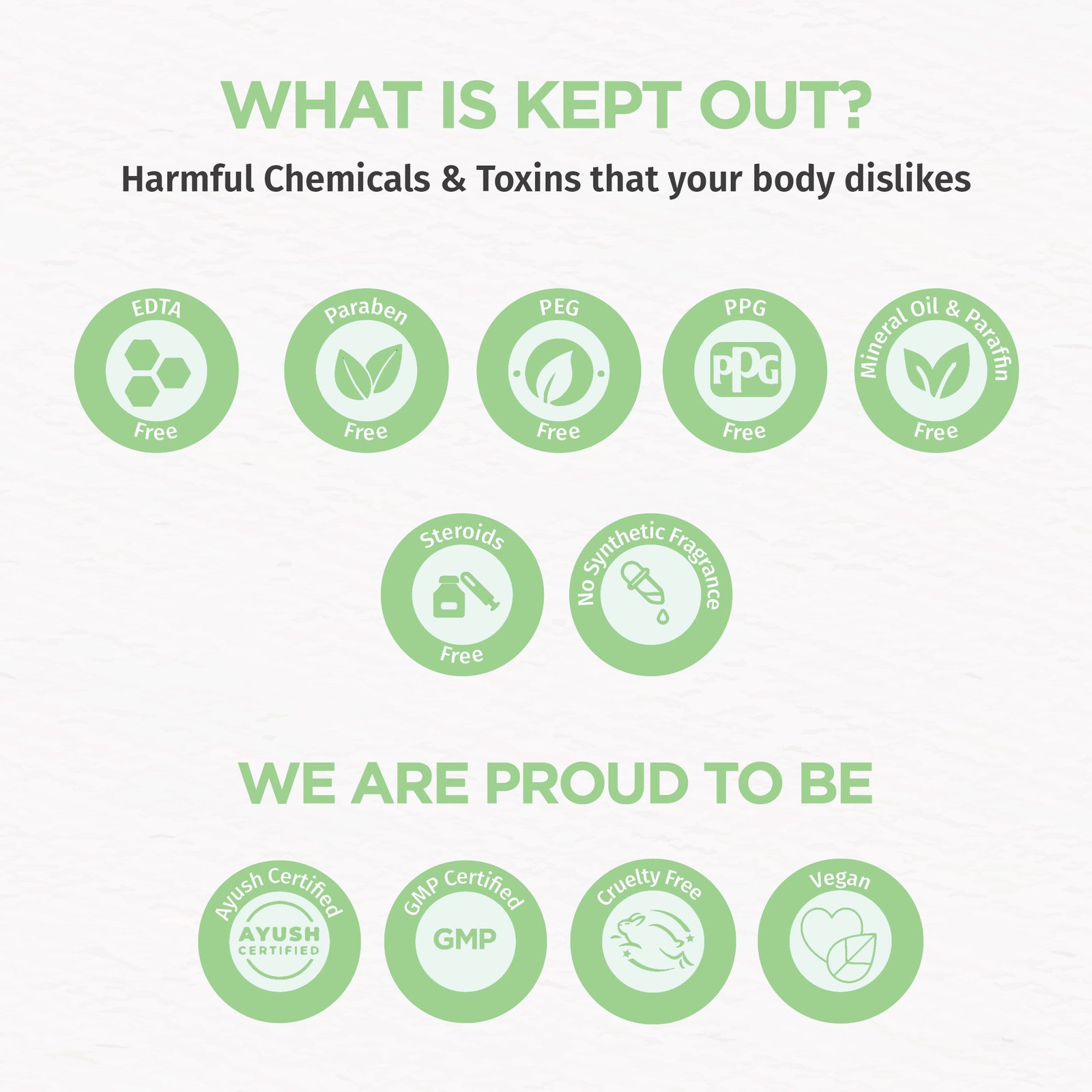 Free from EDTA, Paraben, Mineral Oil & Paraffin, PEG, PPG, EO, Synthetic Colour, SLS (Sodium Laurl Sulfate) and SLES (Sodium Laureth Sulfate)